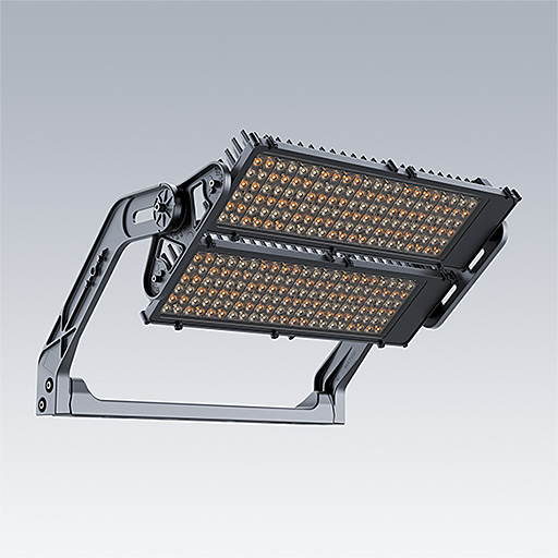 Projecteur LED haute puissance avec distribution lumineuse Optique 1 : extra large; Optique 2 : extra large; de 264 LED. Appareillage externe, Fourni uniquement par Thorn Lighting, à commander séparément (courant de transmission maximum 1050 mA) et câblage via câble de type H07 RN-F et mini-diamètre de 13 mm. Classe électrique I, IP66, IK08. Dissipateur thermique : Moulage sous pression aluminium thermopoudré gris foncé (similaire à RAL 7043). Support de fixation et cadre : gris foncé (similaire à RAL 7043). Fermeture : 4 mm transparent verre. Fourche montée à l’aide des points de fixation disponibles (une vis M20 et deux vis M14). Fonctionnement à faibles papillotements (< 1 %) adapté à une diffusion TV haute définition. Luminaire avec balance des blancs Équipé d’un circuit imprimé noir pour réduire les fuites lumineuses.