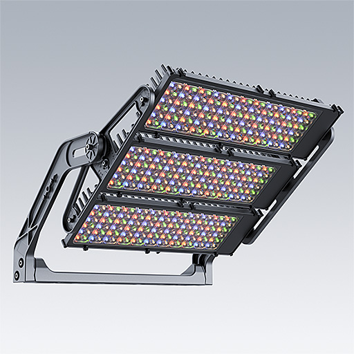 Projecteur LED haute puissance avec distribution lumineuse Optique 1 : faisceau étroit; Optique 2 : faisceau étroit; Optique 3 : faisceau étroit de 396 LED. Appareillage externe, Fourni uniquement par Thorn Lighting, à commander séparément (courant de transmission maximum 850mA) et câblage via câble de type H07 RN-F et mini-diamètre de 13 mm. Classe électrique I, IP66, IK08. Dissipateur thermique : Moulage sous pression aluminium thermopoudré gris foncé (similaire à RAL 7043). Support de fixation et cadre : gris foncé (similaire à RAL 7043). Fermeture : 4 mm transparent verre. Fourche montée à l’aide des points de fixation disponibles (une vis M20 et deux vis M14). Fonctionnement à faibles papillotements (< 1 %) adapté à une diffusion TV haute définition. Luminaire avec teintes de lumière RGBW (rouge, vert, bleu, blanc), 4000 K en Ra > 90 Équipé d’un circuit imprimé noir pour réduire les fuites lumineuses.