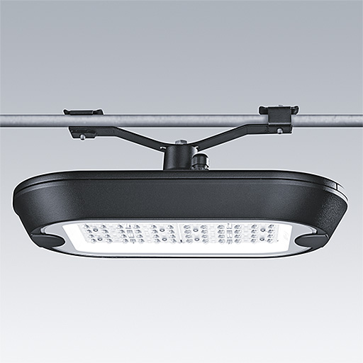 Une élégante lanterne urbaine architecturale et intelligente avec 24 LED alimentés en 500mA et une optique pour Confort pour rue large (symétrique) sans lumière vers le ciel. Electronique, non gradable. Classe électrique II, IP66, Résistance aux impacts : IK10. Corps et socle : Moulage sous pression aluminium (AS9U3, équivalent LM24, EN AC-46000) texturé noir (similaire à RAL9005). Fermeture : 6 mm d’épaisseur transparent verre. Pré-câblé avec 1 m de câble. Montage sur caténaire via 34G, luminaire perpendiculaire à la route. Livré avec LED 3 000 K.