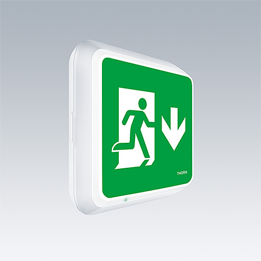 A slim, square, surface mounted, LED safety sign luminaire. Luminaire for central emergency light supply, for single monitoring of the luminaire via Powerline in connection with the eBox System, settable emergency light level. NFC interface for addressing, configuration and maintenance via PROset Pen (article: 22170290) or PROset app, addressing also alternatively possible visually or via EZ-addressing. Power supply: 220-240 Vac (± 10%), 50/60 Hz; 176-280 Vdc. Body: injection moulded polycarbonate, white (RAL 9016). Diffuser: opal polycarbonate, with glued, printed emergency exit direction arrow (down) pictogram according to ISO 7010. Uniform backlighting of pictogram, luminance > 500 cd/m² in the white region and 200 cd / m² on average in mains mode (according to DIN 4844), 2 cd / m² minimum in emergency mode (according to EN 1838). Recognition distance according to EN 1838: 44m. Class II electrical, IP65, Impact strength: IK10. ambient temperature: -30°C to +35°C. Suitable for direct mounting to wall. Loop-in, loop-out is possible for cables up to 2.5 mm². BESA compatible. Food certificate (to be used in areas with fully packaged food). Luminaire wired with halogen free and silicone free leads. Luminaire with D symbol (for use in environments in which the accumulation of conductive dust on the luminaire can be expected).