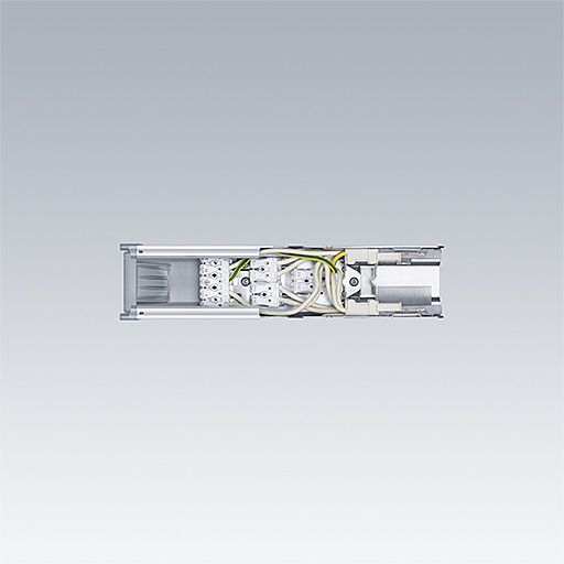 Electrical feed-out, white. Roll-formed sheet steel for electrical conection of continous row system. Plug-in connecting terminals for 5 mains cables, 2 x 2 emergency lighting cables and 2 control lines. End caps included.