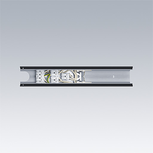Electric feed, white, made of roll-formed sheet steel; for the electrical connection of the continuous row system. Plug-in connecting terminals for 5 mains cables, 2 x 2 emergency lighting cables and 2 control lines. Includes end caps and protective covers to prevent accidental contact with electrical conductors.