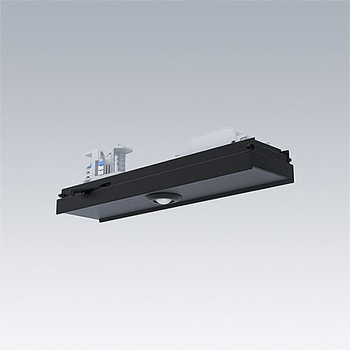 CONTUS module with integrated basicDIM ILG G2 sensor and DALI control unit is ideal for industry, logistics, offices and education. The adapter in black enables tool-free installation on the trunking via a lever on the side.