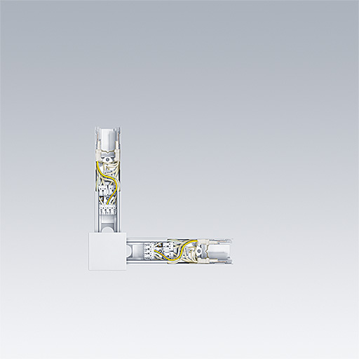 L shaped mechanical and electrical connector, white. Features two male ends for mechanical connection and 2 groups of terminal blocks for electrical feed in, or feed out.