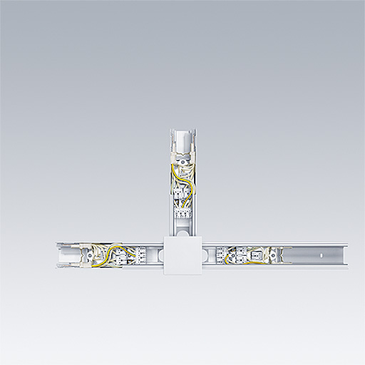 T shaped mechanical and electrical connector, white. Features one female and two male ends for mechanical connection and 3 groups of terminal blocks for electrical feed in, or feed out.