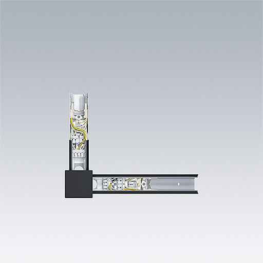 L shaped mechanical and electrical connector, black. Features one male and one female end for mechanical connection and 2 groups of terminal blocks for electrical feed in, or feed out.