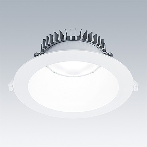 A low height, recessed LED downlight. Suitable for ceiling cut-outs Ø190-230 mm for easy refurbishments or fast initial installations. Remote, pluggable, Fixed output LED driver. Loop in - loop out possible. Body: plastic for thermal management. Diffuser: polycarbonate, smooth reflector in white finish with wide beam. Reflector and trim: high quality, highly reflective polycarbonate. Class II electrical, IP20. Spring clips suitable for ceiling thicknesses from 1 to 35 mm. Complete with 4000K LED