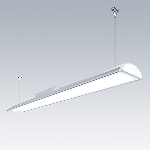 A suspended linear LED high bay. Electronic, fixed output control gear. Body: extruded aluminium, powder coated silver. Optics: Linear PC lens and diffuser for a comfortable lighting effect. Mains voltage: 220-240VAC / 50-60Hz. Complete with 3000K LED.