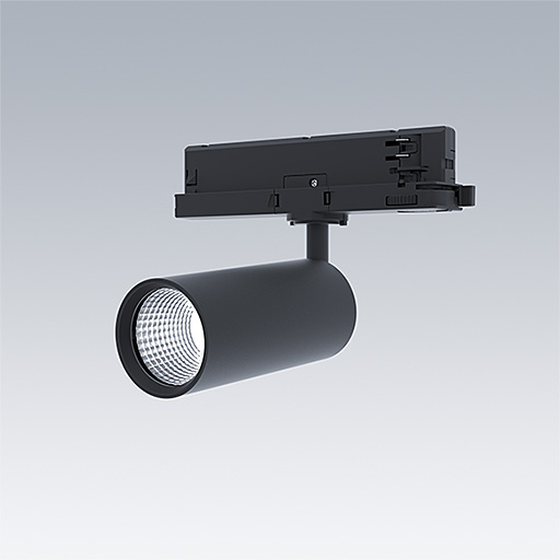 LED spotlight for 3 phase track installations with flood light distribution and stabilized color temperature. Electronic, fixed output control gear. Class II electrical, IP20. Body: Die-cast aluminium black micro-textured paint. Reflector: PC sputtered. Spotlight rotatable through 360° and pivotable through 90°. Complete with 3000K LED
