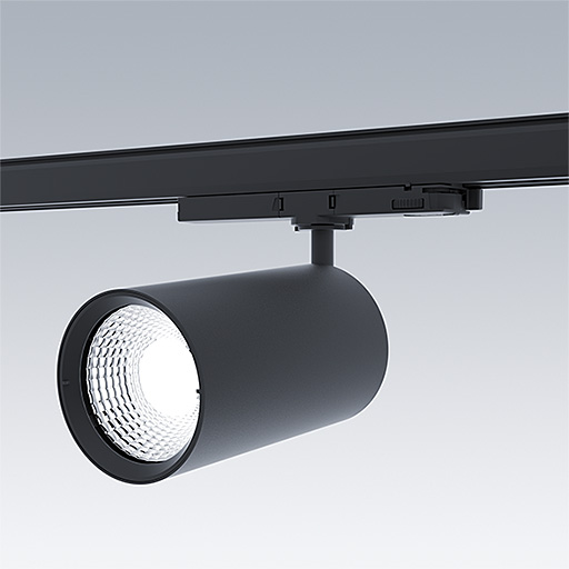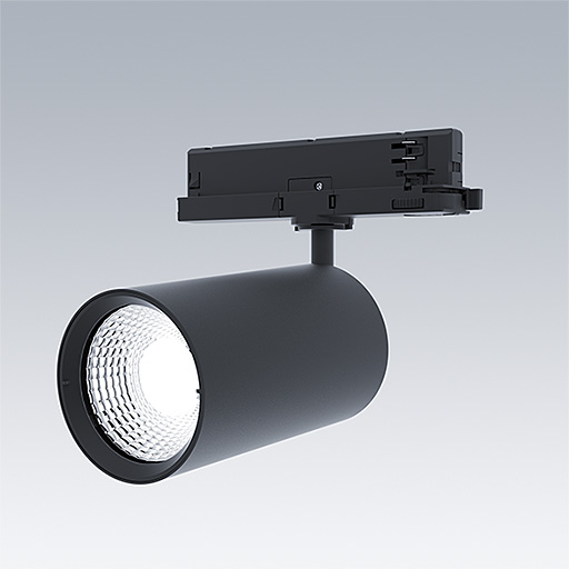 LED spotlight for 3 phase track installations with spot light distribution and stabilized color temperature. Electronic, fixed output control gear. Class II electrical, IP20. Body: Die-cast aluminium black micro-textured paint. Reflector: PC sputtered. Spotlight rotatable through 360° and pivotable through 90°. Complete with 3000K LED