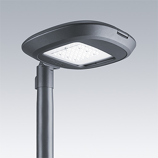 A highly versatile LED lantern with a Narrow Road, asymmetric distribution. Electronic, fixed output control gear driving 12 LEDs at 1,05A. Compatible with PL, LRT, 7 pin Nema socket. Class II electrical, IP66, IK10. Housing, canopy and spigot: Die-cast aluminium (EN AC-47100) powder coated anthracite (close to RAL7043).. Enclosure: 6mm thick clear glass.. Complete with 4000K LED. Post top mounting to Ø60mm column, tilt 5°, adjustable from 0° to +10°.
