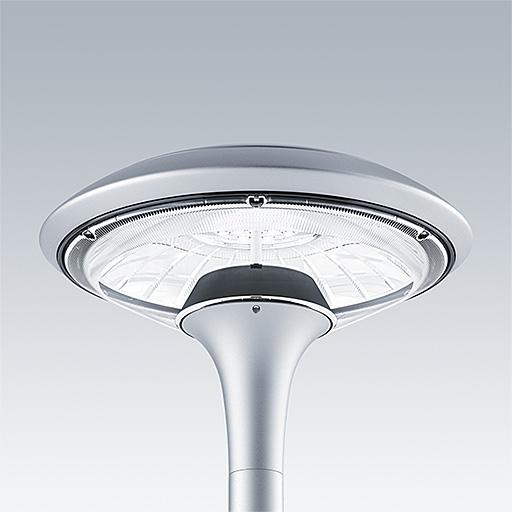 Plurio Direct: A decorative post-top LED lantern with radially symmetric distribution. LED driver with 18 LEDs driven at 350mA. Class II electrical, IP66, IK08. Base: cast aluminium, powder coated silver-grey. Canopy: disc shape, aluminium, textured silver-grey. Diffuser: UV stabilised, clear polycarbonate with anti-glare prisms. Direct, lens based optic with internal reflector. Equipped with 50% power reduction circuit, effective 3 hours before and 5 hours after a calculated midnight. It can be deactivated at installation with an easily accessible internal switch. Complete with 4000K LED. Post top mounting to Ø60mm column.